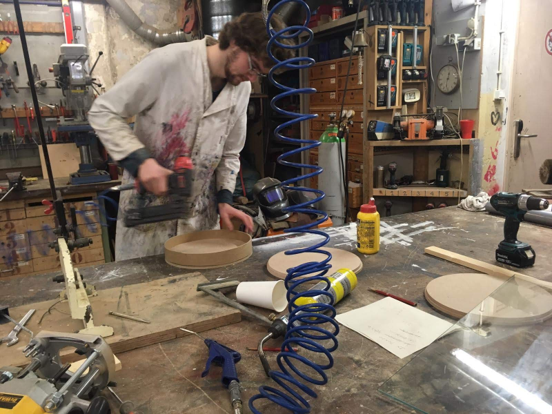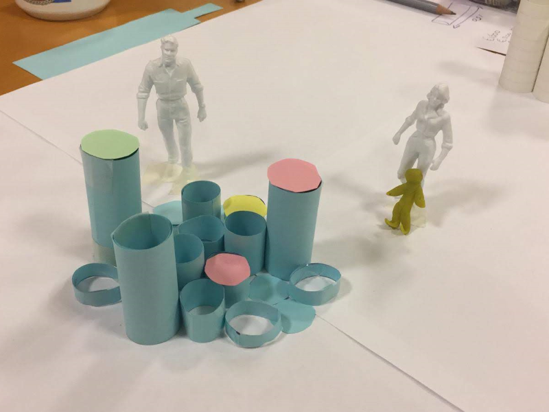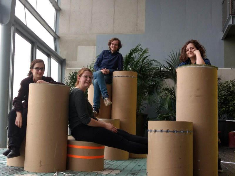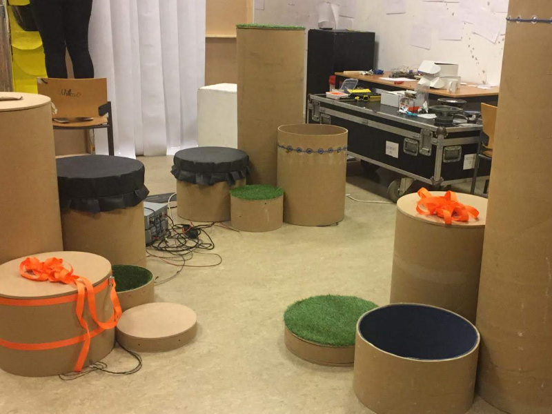 The installation has four sound sources which react to the explorer using pressure and light sensors. Three speakers are hidden inside the cylinders and one surface transducer is attached to a lid. One of the taller cylinders has LED lights inside which react to sound. The cylinders have different finishes: artificial grass, yoga or rubber mats and tied rope.