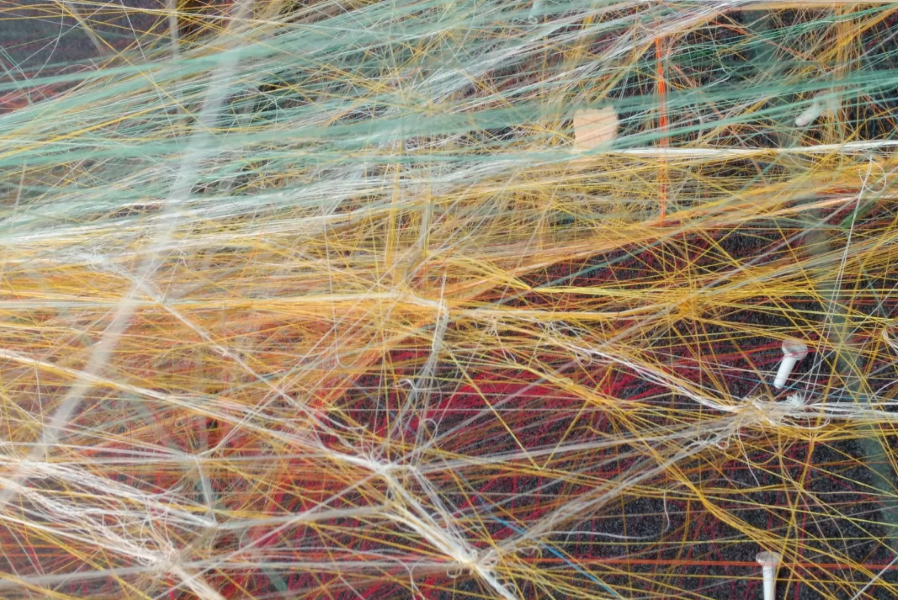 An installation in which people are invited to join in creating together. While listening to the stimulating music people gaze into a detailed network of threads and add to it using the spool of thread they were given.