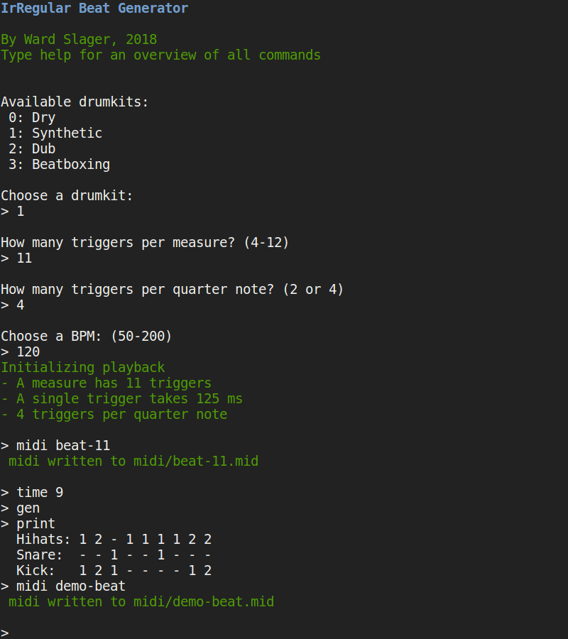 Now that generation is done the beat will start playing using the built-in drumkits. The user has options to regenerate, write to midi or change generation parameters.